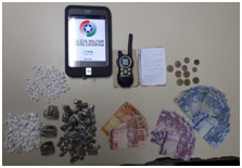 Soldados apreenderam um saco plástico contendo maconha, cocaína, R$ 146, caderno contendo anotações do tráfico de drogas e um rádio comunicador para avisar o “patrão” sobre eventual presença da polícia. Mas pelo visto desta vez não deu tempo.