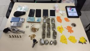 Além do revólver, ele tinha ecstasy, maconha, cocaína e dinheiro.  O homem de 30 anos foi autuado em flagrante por tentativa de homicídio e tráfico de drogas.