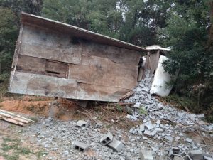 Um caminhão carregado com bloco de concreto caiu num barranco na Rua Castro Alves, Bairro Vila Nova, em Rio Negrinho. O motorista de 58 anos, disse que, devido ao excesso de peso, a caixa de marchas quebrou.