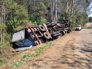 Um trecho do KM 11 da rodovia SC-305, na localidade Lajeado Antunes, entre São Lourenço do Oeste e Campo Erê, no Oeste do Estado, está interditada para a retirada de uma carreta que tombou no local.