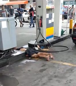 O suspeito foi chutado, agredido a socos, paulada e caiu na entre duas bombas de abastecimento.