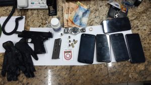 Embaixo do banco do motorista, foi apreendida uma sacola contendo pistola calibre 380, com numeração raspada, munição, celulares, joias e R$ 175.