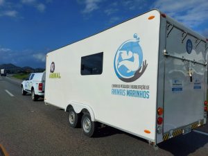 O filhote de baleia foi transportado em um veículo adaptado, no início da tarde e seguiu pela BR-101 com destino ao hospital de animais, que funciona dentro do Parque Estadual do Rio Vermelho, no Leste da Ilha.
